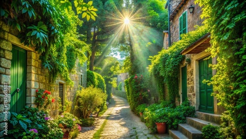 © prapatsorn, Obraz premium Sunlit Green Alleyway, Trsteno Arboretum, Dubrovnik - Tilt-Shift Photography
