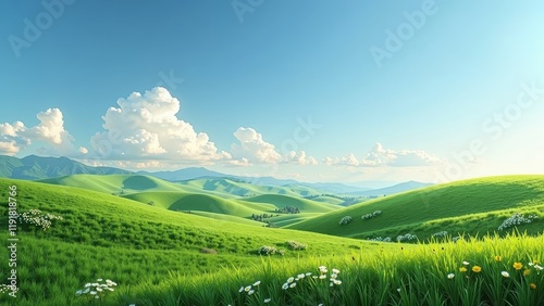 Fototapeta premium Sunlit green field, eye-level vista; serene mountains silhouette against a...