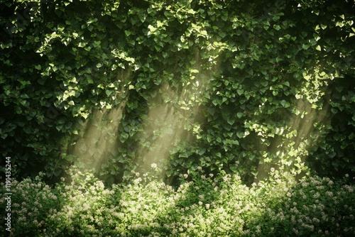 © jambulart, Obraz premium Sunlit green foliage, blooming white flowers below.
