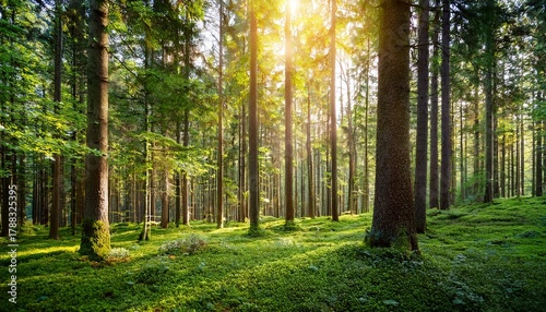 Fototapeta premium sunlit green forest floor with tall trees