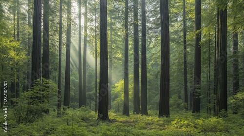 Fototapeta premium Sunlit Green Forest Misty Morning Sunlight Beams Through Tall Trees