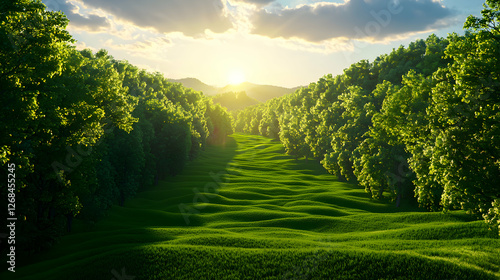 © Arthur Constantine, Obraz premium Sunlit Green Forest Path at Sunset