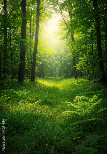Obraz premium Sunlit Green Forest Path with Tall Trees and Lush Vegetation