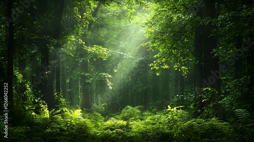 © artzone, Obraz premium Sunlit Green Forest With Lush Undergrowth