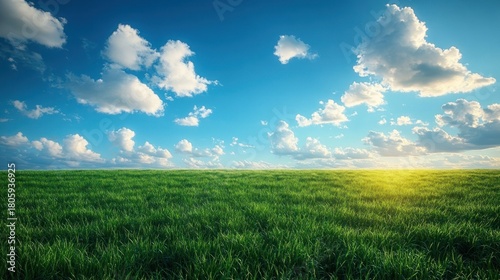 Obraz premium sunlit green meadow under a wide blue sky with fluffy clouds, peaceful horizon evoking calm and hopeful serenity