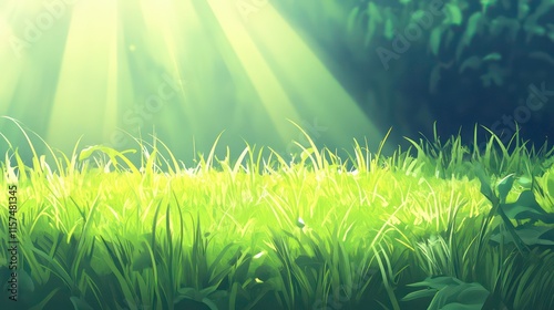 Obraz premium Sunlit green meadow: vibrant natural background with glowing sunrays and lush grass
