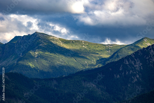 Fototapeta premium Sunlit green mountain slopes with rocky ridges under dramatic cloudy sky