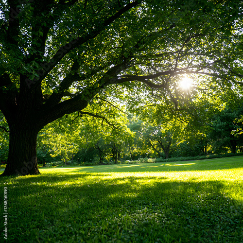 © Arthur Constantine, Naklejka premium Sunlit Green Park Landscape with Large Tree