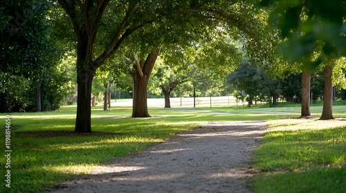 © The Little Hut, Obraz premium Sunlit Green Park Pathway with Tall Trees Peaceful Retreat : Generative AI