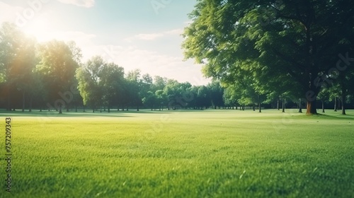 Fototapeta premium Sunlit Green Park With Fresh Morning Dew