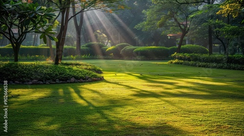 © Oksana, Obraz premium Sunlit green park with trees casting long shadows.