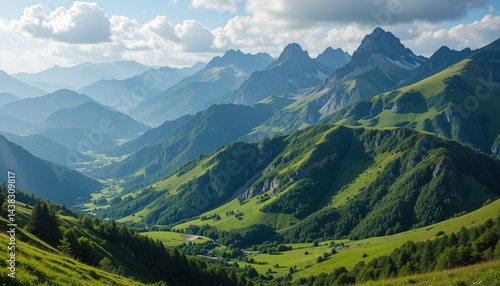 © Jacket, Fototapeta premium Sunlit Green Valley Nestled within Majestic Mountain Peaks
