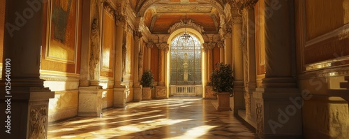 © Svitlana, Fototapeta premium Sunlit hallway in historic european mansion with ornate architecture and golden decor