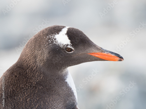 Obraz premium Sunlit Head of an adult Gentoo penguin with its orange beak and dark gray and...
