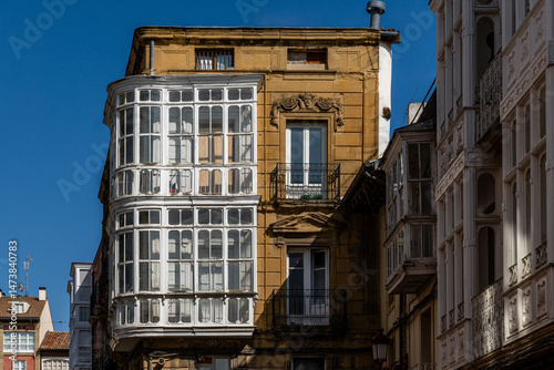 Fototapeta premium Sunlit Historic Building with Traditional Balconies and Stone Facade in Haro,...