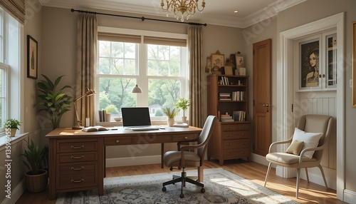 © Sam, Fototapeta premium Sunlit Home Office Design: Elegant Workspace with Wooden Desk & Chair