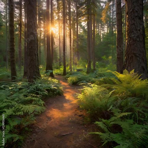 © mustafiz, Fototapeta premium Sunlit in a forest before sunset end of summer