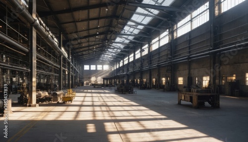 Obraz premium Sunlit Industrial Interior: A Vast and Eerie Factory Space