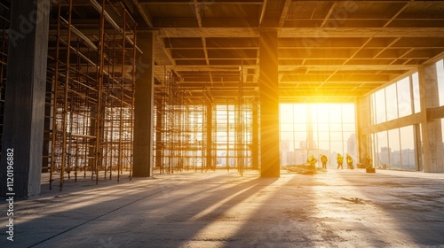 © Azis Stock, Obraz premium Sunlit interior of a building under construction, showing scaffolding, concrete structure, and workers.