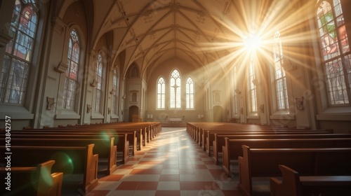 Fototapeta premium Sunlit Interior of a Church with Beautiful Lens Flare Effect and Wooden Pew...