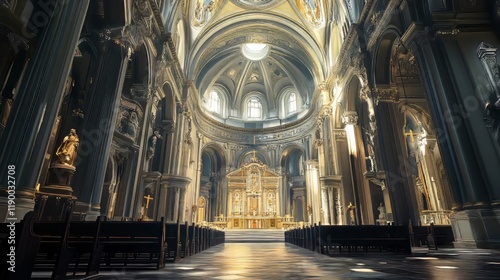 © KOOLAIDMAN100X, Naklejka premium Sunlit interior of a grand cathedral