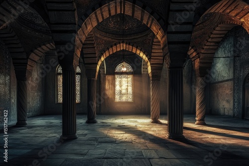 © Hamba, Fototapeta premium Sunlit interior of an ancient arched hall