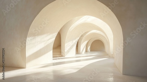 Fototapeta premium Sunlit Interior With Arched Hallways And Stairs