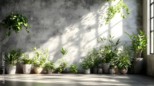 Fototapeta premium Sunlit Interior with Greenery and Concrete Wall - 3D Illustration