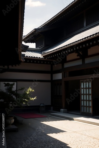 © Baha, Fototapeta premium Sunlit Japanese courtyard with traditional architecture. (1)