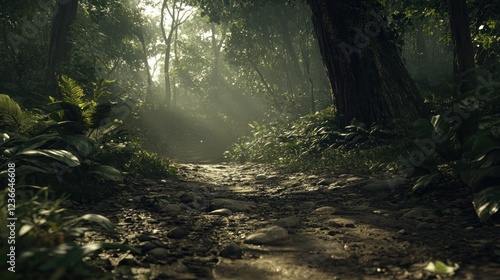 © yusufadi, Obraz premium Sunlit Jungle Path: A Mystical Trek Through Lush Foliage