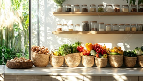 Fototapeta premium Sunlit Kitchen Counter with Fresh Produce in Woven Baskets, Healthy Eating...