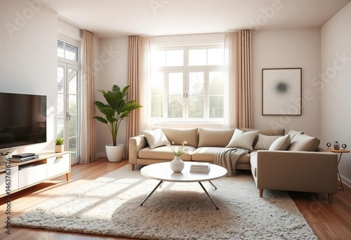 Fototapeta premium Sunlit living room, neutral palette, comfy sofa, modern coffee table, plush...