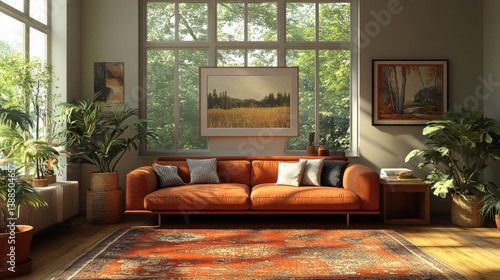 © Ari, Obraz premium Sunlit Living Room with Orange Sofa and Lush Greenery