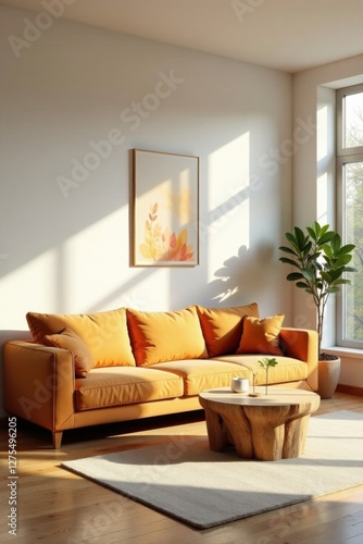 Fototapeta premium Sunlit Living Room with Orange Sofa and Wooden Coffee Table