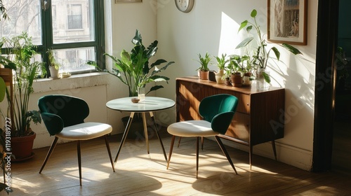 © cgrtart, Obraz premium Sunlit living room with plants, chairs, and mid-century cabinet.