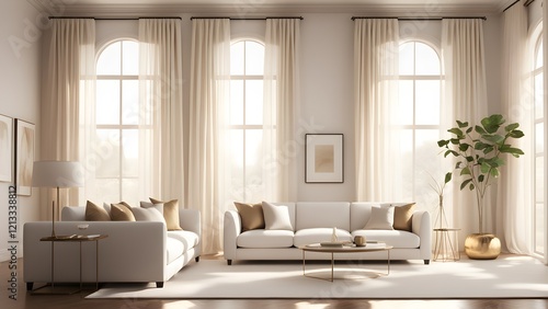Fototapeta premium Sunlit living room with white sofas, beige curtains, and gold accents.