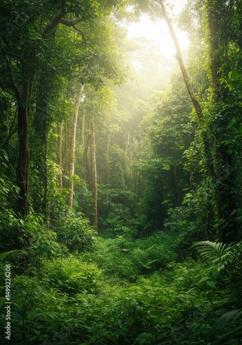 © SweaterWeather, Fototapeta premium Sunlit Lush Green Forest With Dense Vegetation