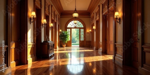 © Nova, Fototapeta premium Sunlit Mahogany Hallway with Elegant Architectural Details and French Doors Leading to a Serene Garden