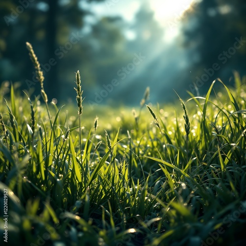 © fadhel, Fototapeta premium Sunlit Meadow: A Serene Grassland bathed in Golden Hour Light