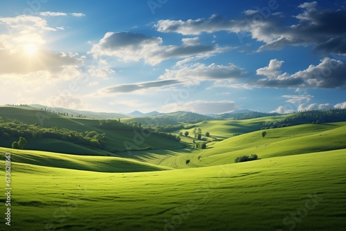 © KerXing, Obraz premium Sunlit meadow and rolling hills forming a serene natural landscape