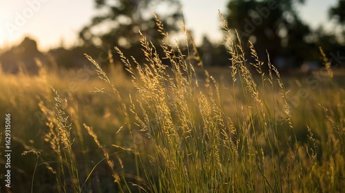 © Ming, Obraz premium Sunlit meadow with tall swaying grass, capturing golden hour's joyful atmosphere.