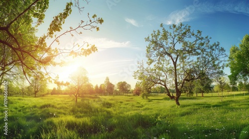 © rejeqy, Fototapeta premium Sunlit Meadow with Trees