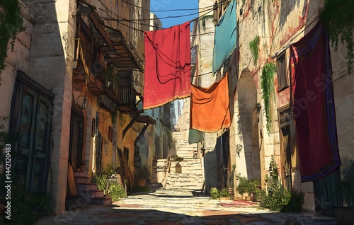 © sasisom, Fototapeta premium Sunlit Mediterranean Alleyway with Colorful Hanging Textiles