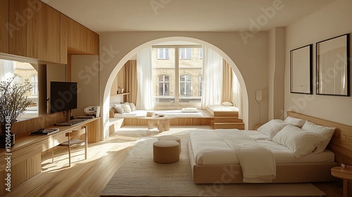 Fototapeta premium Sunlit minimalist bedroom with arched window, wooden floors, and built-in...