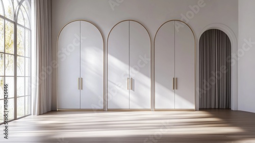 © azi, Obraz premium Sunlit minimalist room with arched white doors and hardwood floor.