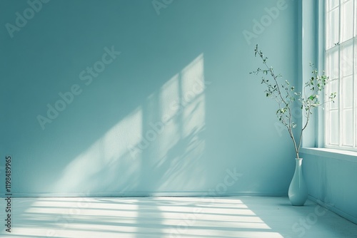 © Adri, Obraz premium Sunlit minimalist room with blue wall, vase, and plant.