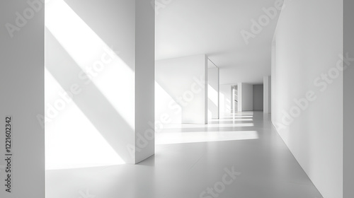 Fototapeta premium Sunlit minimalist white hallway with columns and doors.