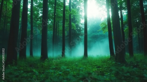 © ms25designs, Naklejka premium Sunlit misty forest scene with tall trees and lush green undergrowth.