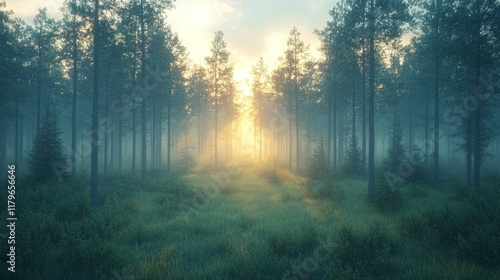 © TITISCAHYA, Obraz premium Sunlit misty pine forest path.