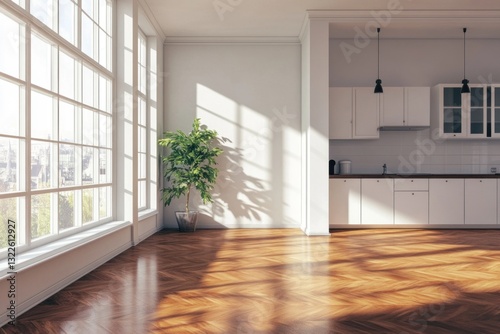 Fototapeta premium Sunlit modern apartment interior with hardwood floors and kitchen.